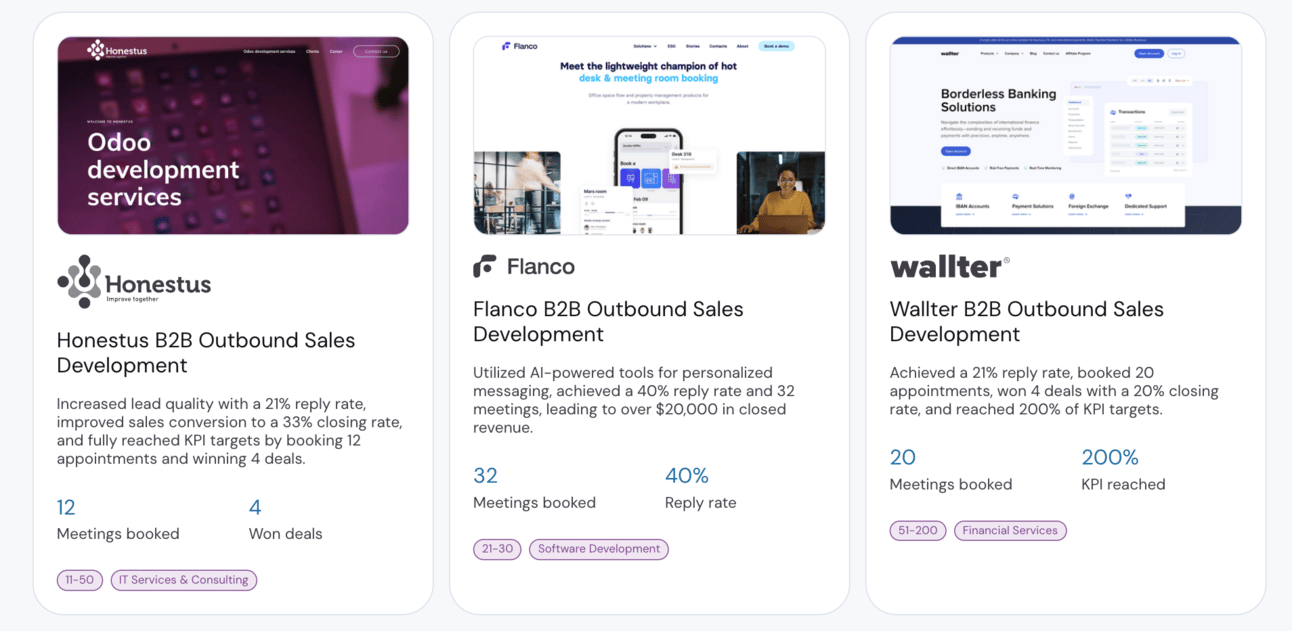 Increased efficiency and time savings: By leveraging the strengths of both partners, the service streamlines the sales and marketing process. Clients save valuable time and resources, eliminating the need to manage multiple aspects internally and focusing on what they do best.
